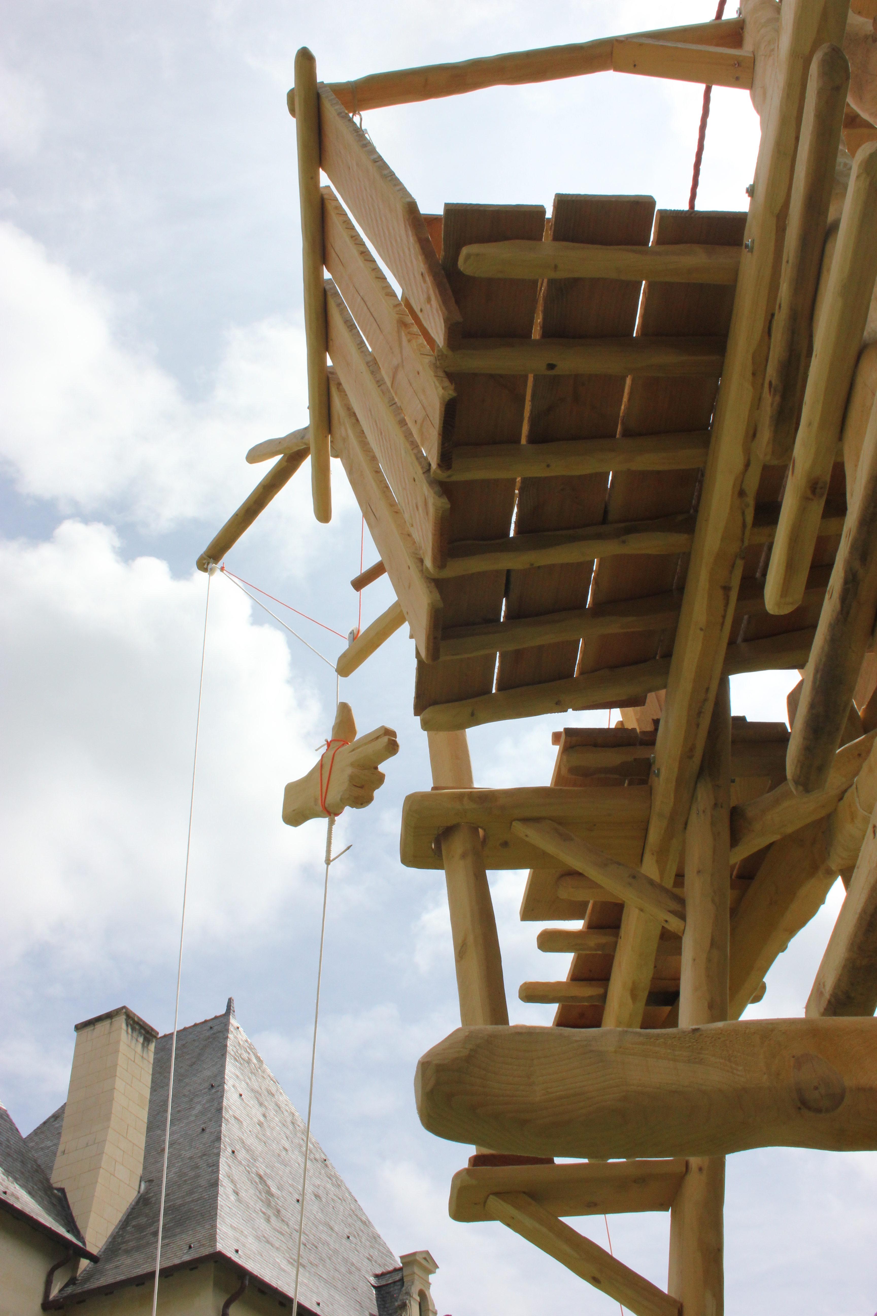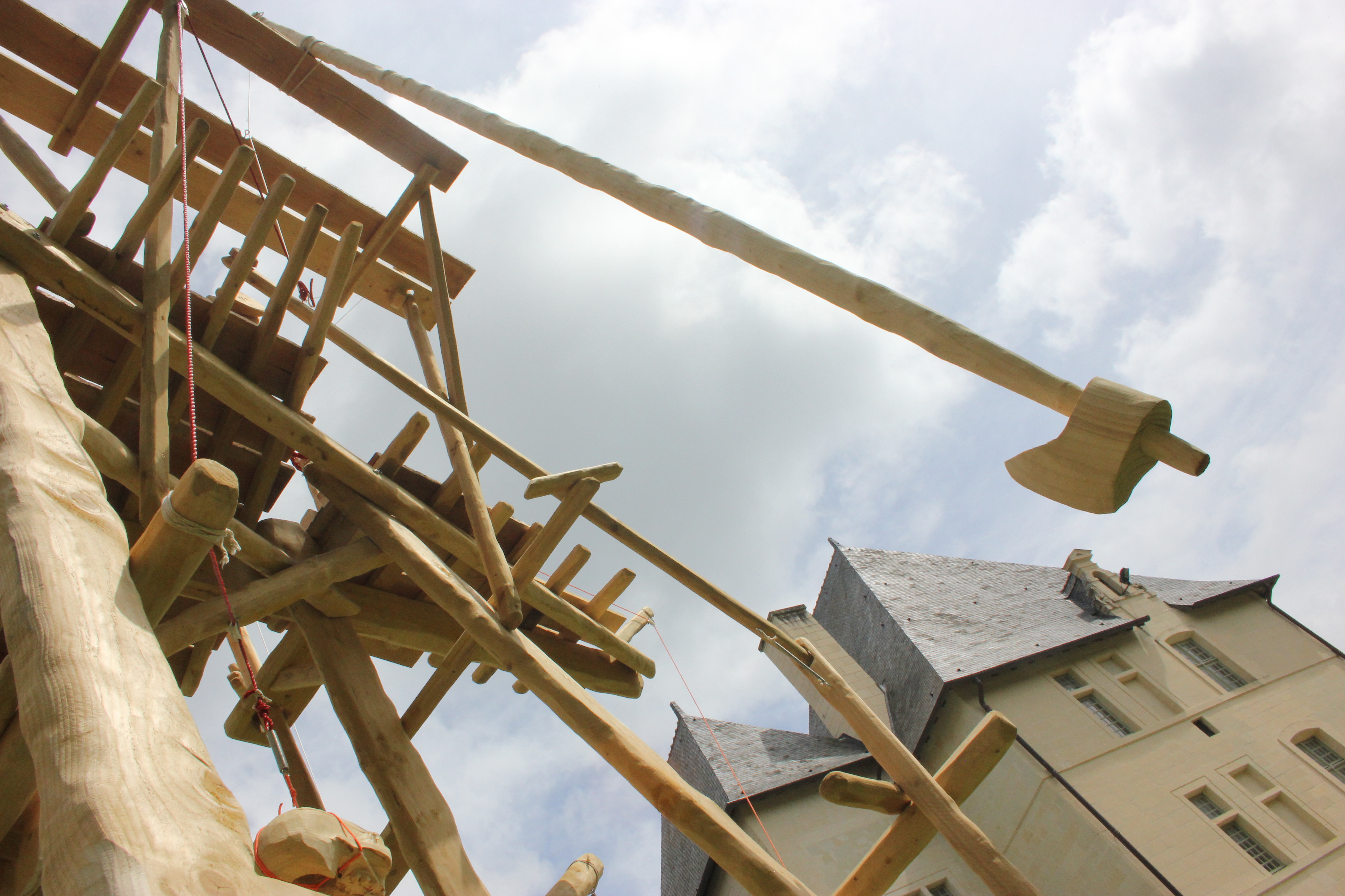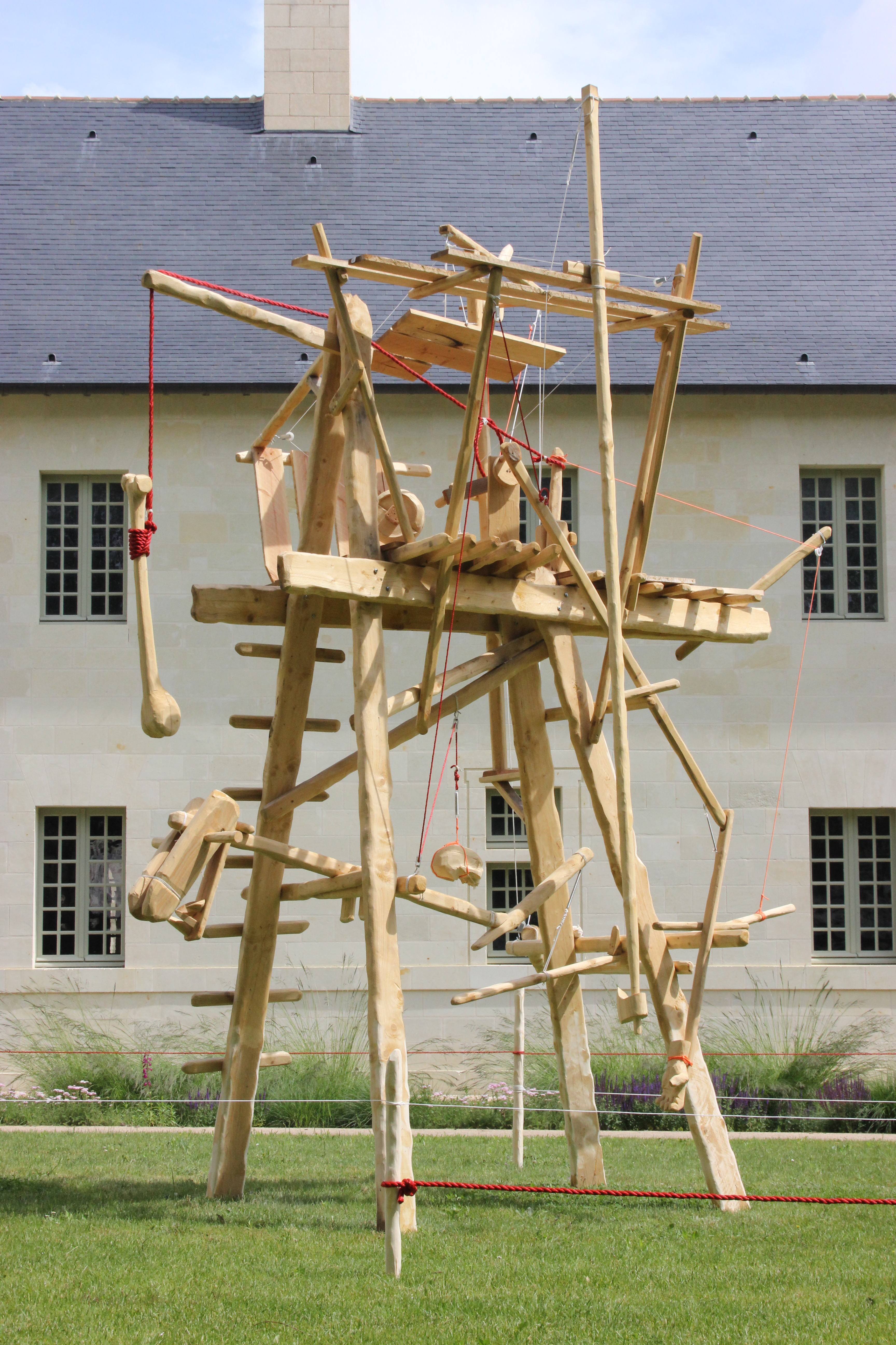 Résidence Grand air / Abbaye de Fontevraud – 2018. Pin, éléments métalliques, ficelles polyesther et coton.500 x 400 x 300 cm